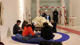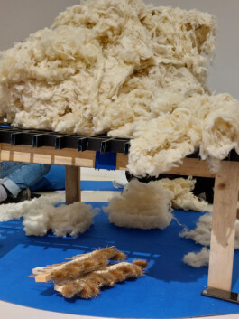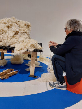 Performance (en trois happenings), laine cardée transformée en feutre, portant en bois, moquette au sol, 3,5 x 3,5 m, 2023